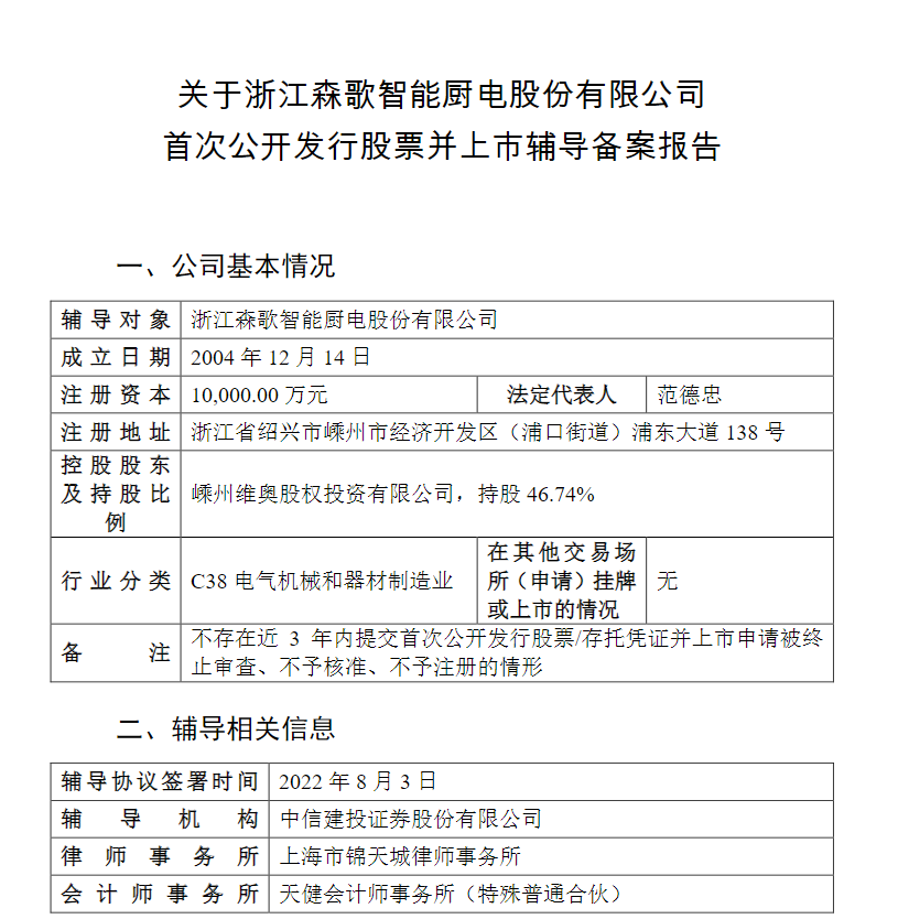 8月18日,證監(jiān)會(huì)網(wǎng)站披露,浙江森歌智能廚電股份有限公司進(jìn)入IPO輔導(dǎo)備案期,已于2022年8月3日與輔導(dǎo)機(jī)構(gòu)中信建投證券股份有限公司簽署輔導(dǎo)協(xié)議。2021年,森歌智能廚電獲得金鼎資本3000萬(wàn)人民幣戰(zhàn)略融資。今年6月,完成股改的浙江森歌電器有限公司更名為“浙江森歌智能廚電股份有限公司”。